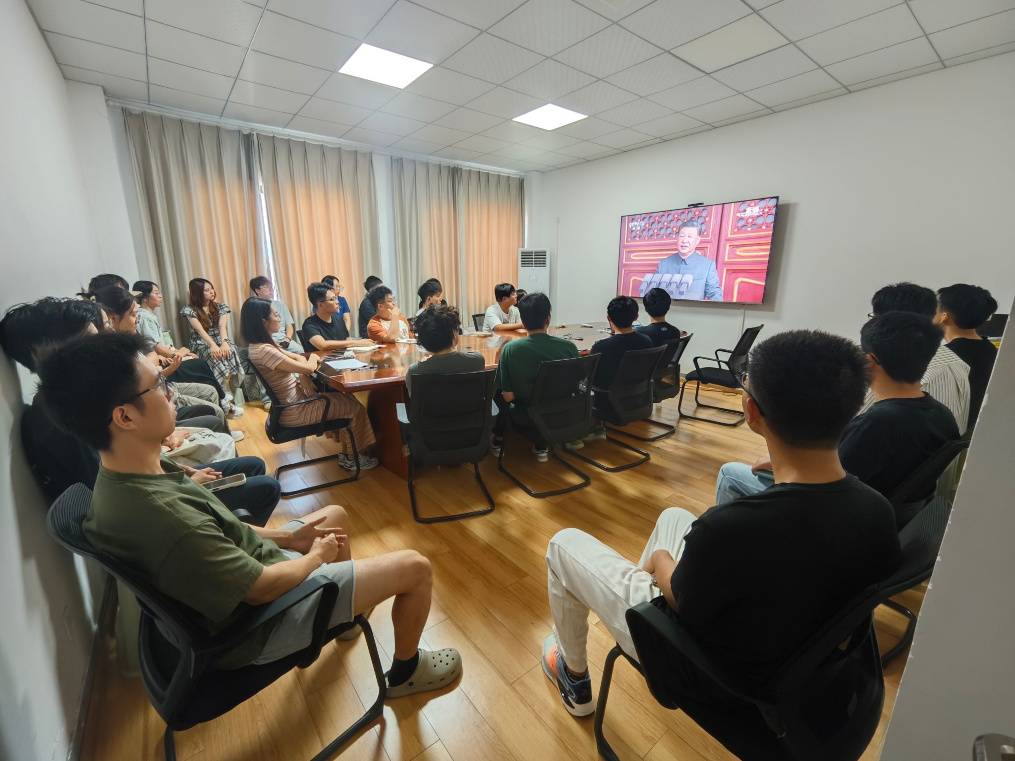 学生党建办公室成员、学生党支部党员代表在文华楼523室观看纪念大会