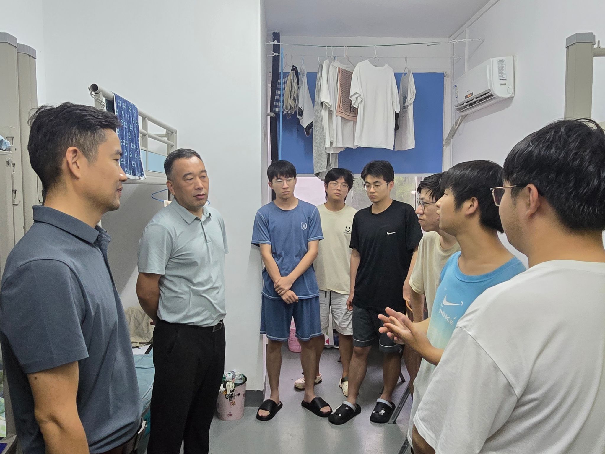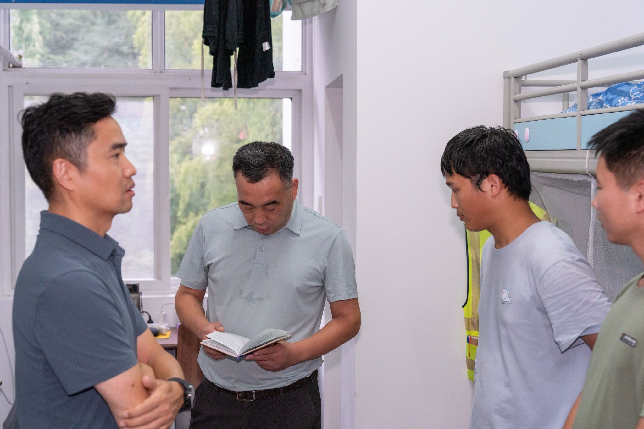随后,院长一行走进男生宿舍,关怀同学们的起居生活,查看野外记录簿,并就实习感受与对秭归实习的建议意见与大家亲切交谈。他表示,学院将积极研究引入无人机等新技术手段,丰富“地质新三件”教学应用,进一步提升野外实践教学的质量与实效。