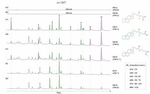 国产精品久久久久久久久久朱钢添副教授团队选取南襄盆地泌阳凹陷原油作为研究对象,通过气相色谱-质谱(GC-MS)、全二维气相色谱-飞行时间质谱(GC×GC/ToF-MS),系统分析了一系列母源关系接近但生物降解等级不同的原油样品中的甾烷酸分布。GC-MS分析结果表明,在未降解和低降解等级的原油样品中,未检出甾烷酸信号,只有在生物等级较高(规则甾烷开始发生明显降解)的原油样品中才能检测到甾烷酸,说明该类酸性生物标志物是甾烷的生物降解产物(图1)。