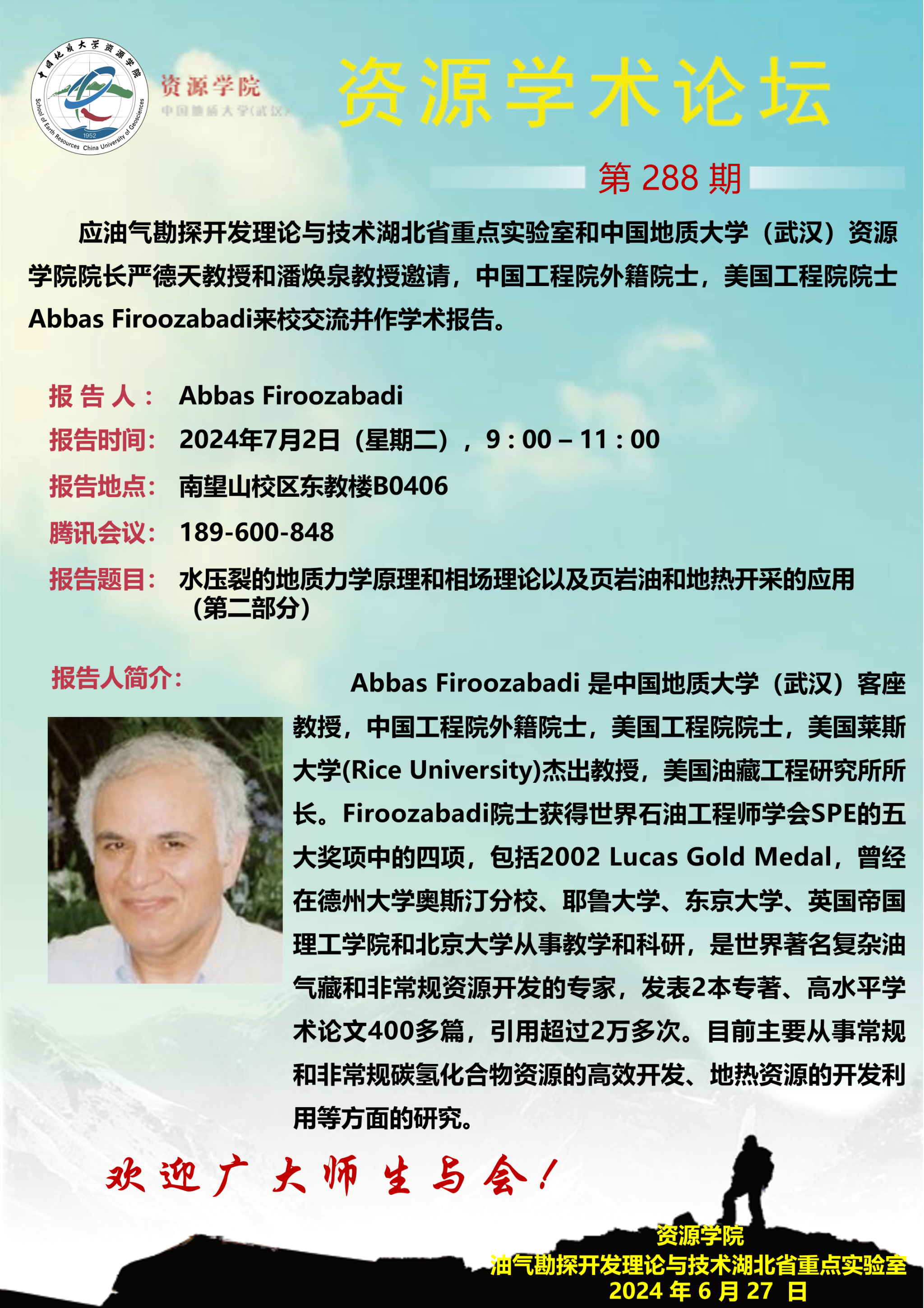 【7月2日】第288期资源学术论坛:Abbas Firoozabadi学术报告