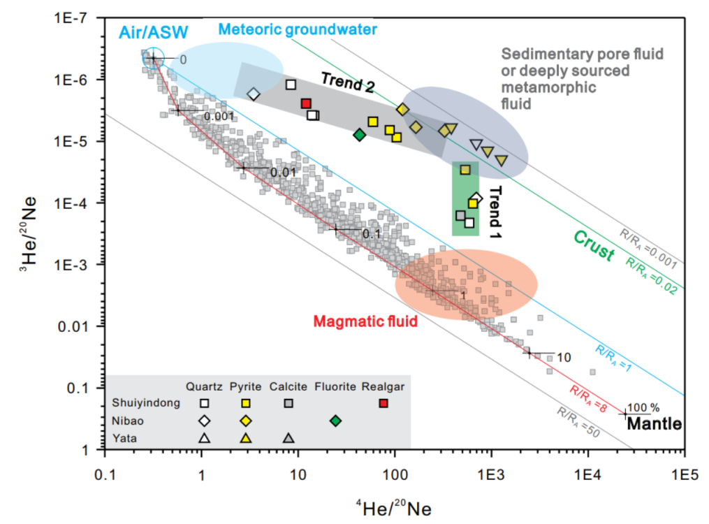 图3.水银洞、泥堡和丫他金矿床不同热液矿物流体包裹体3He/20Ne vs.4He/20Ne相关性图解显示卡林型金矿床的初始成矿流体具有岩浆来源特征,成矿作用过程中先后与地壳浅部沉积岩中的孔隙流体或深源变质流体及循环大气降水发生了混合作用