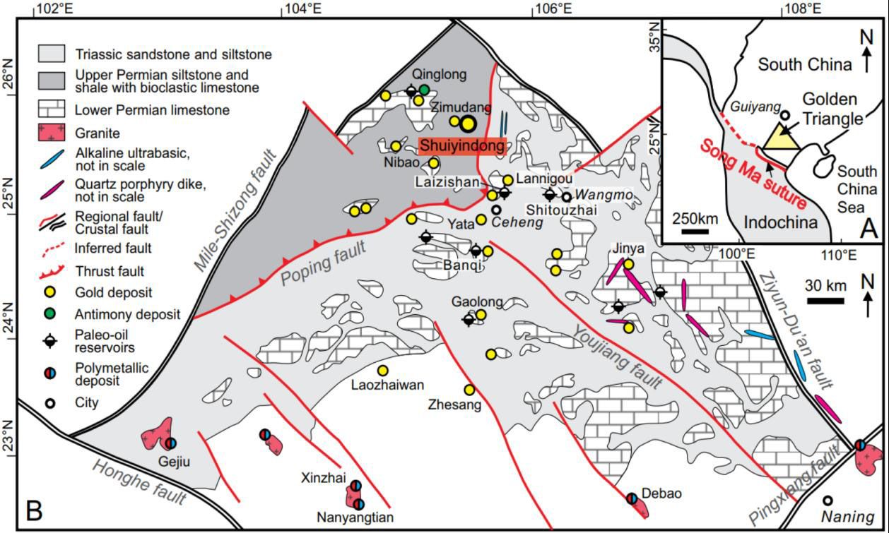 成矿物质来源与成矿时代是矿床学研究最重要的内容。成矿物质来源,尤其是成矿流体的来源与演化是理解和认识矿床成因的重要依据;而精确确定矿床的形成时代是了解成矿作用与相应地质构造活动的联系并最终构建矿床成因模型的关键。对于卡林型金矿床而言,由于主要矿物颗粒细小、共生关系复杂、存在多期增生结构且成矿后的热液事件可能改变或重置矿物的同位素组成,使得传统的地球化学示踪手段和同位素测年技术很难获得真正的成矿作用信息,即真实的成矿物质来源和成矿年龄。因此,这类矿床的示踪和测年一直是国内外矿床学研究的重点和难点。