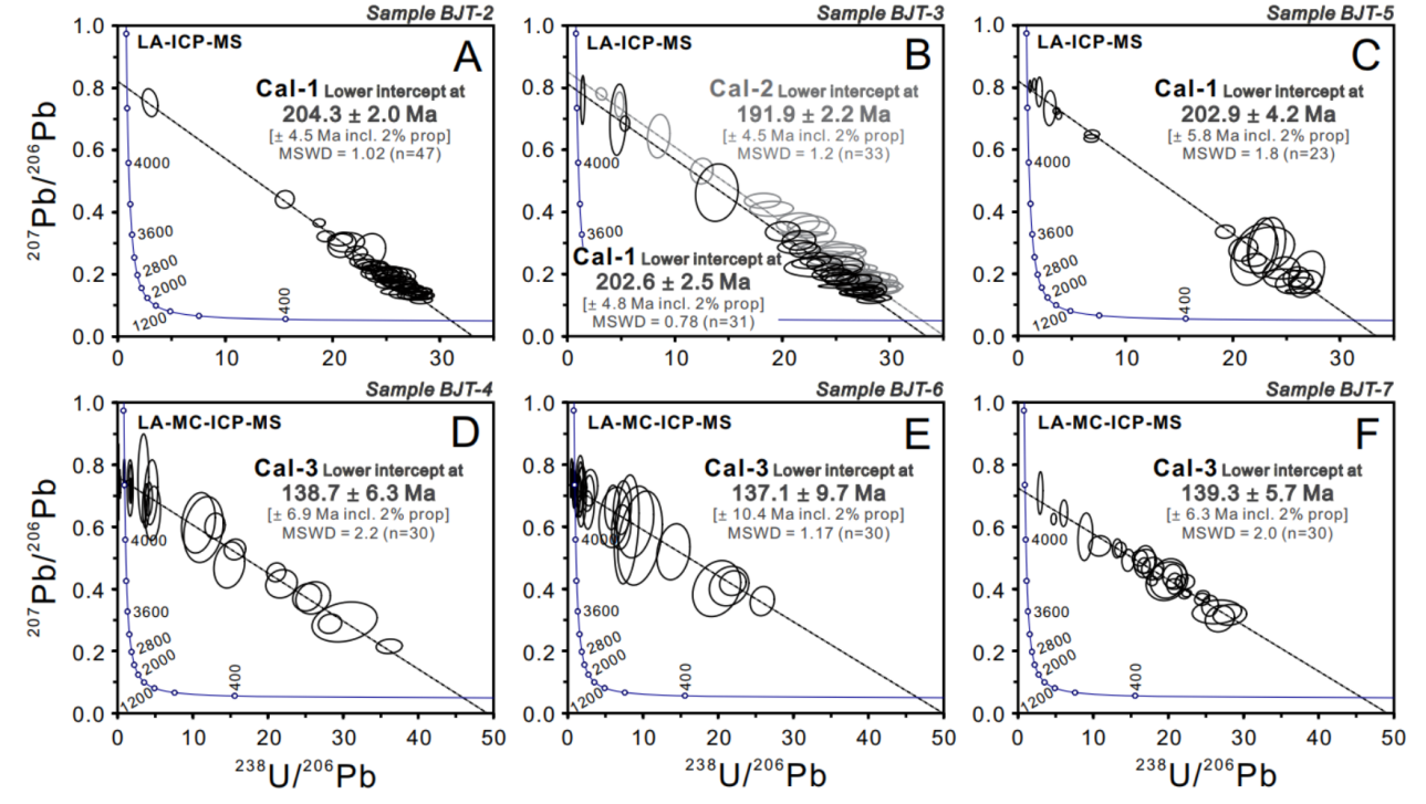 图4.右江盆地水银洞金矿床六件样品中不同世代方解石U-Pb测年结果