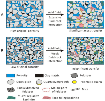 下石盒子组致密砂岩流体-岩石相互作用期间,由水-岩反应形成的离子浓度梯度并由此导致的短距离扩散运移是埋藏阶段成岩物质迁移的主要方式。在有机酸侵入厚层心滩和辫状河道砂体过程中,砂岩较高的原始孔隙度会导致强烈的流体-岩石相互作用。该过程可在长石溶蚀过程中导致显著的物质迁移,并导致高百分比的孔隙充填高岭石(相对于原地沉淀高岭石)。相比之下,由于薄层的泛滥平原沉积微相的原始孔隙度相对较低,因此形成了相对较弱的流体-岩石相互作用,长石溶解过程中离子浓度较低并导致较弱的物质迁移。因此在泛滥平原沉积微相中,原地沉淀的高岭石更为丰富。两处自生高岭石的空间分布模式表明在高岭石沉淀过程中,层内溶解物质的扩散迁移是主要的成岩物质迁移机制(图3与图4)。