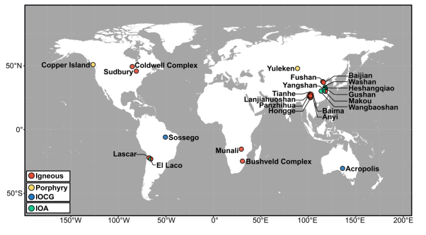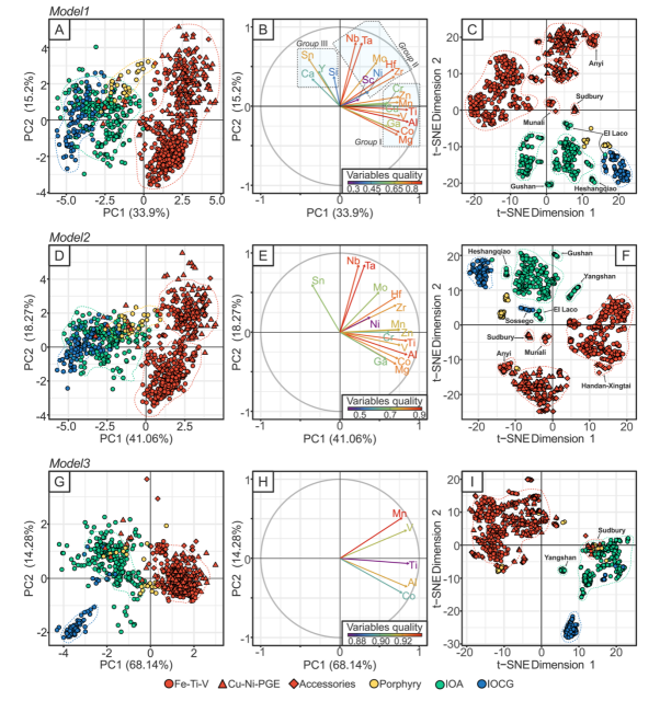 国产精品久久久久久久久久2021届硕士毕业生胡斌和博士后曾丽平,在导师赵新福教授指导下,收集了全球典型高温成矿系统,包括岩浆成因矿床(钒钛磁铁矿、铜镍硫化物矿床)、高温热液矿床(斑岩铜矿、IOCG矿床)、IOA矿床及相关的岩浆岩中已发表的原生高钛磁铁矿的LA-ICP-MS元素数据(图1),对数据集进行了两种无监督方法(主成分分析[PCA]和t分布随机邻域嵌入[t-SNE])的机器学习分析,通过大数据统计分析和建立机器学习模型,建立了不同成因高钛磁铁矿的微量元素组成特征。