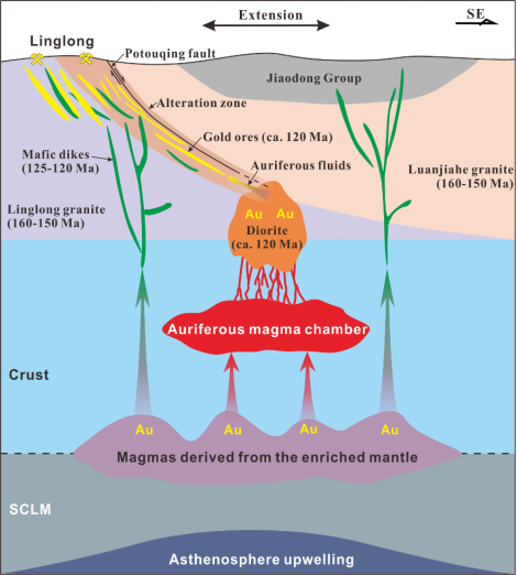 图2.华北克拉通破坏峰期胶东地区深部岩浆活动与浅部巨量金成矿模式图