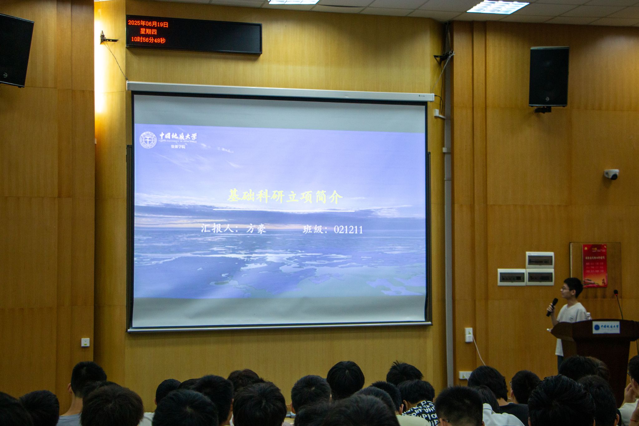 在朋辈宣讲环节,学校十大标兵学生方豪以《基础科研立项简介》为题,分享了大学期间参与基础科研立项的感受和收获。学校“科学家故事我来讲”演讲比赛特等奖团队代表、“睿至科学家精神宣讲工作室”成员梁芳华以《成为追光者》为题讲述了了中国地质力学的创始人李四光先生的故事。