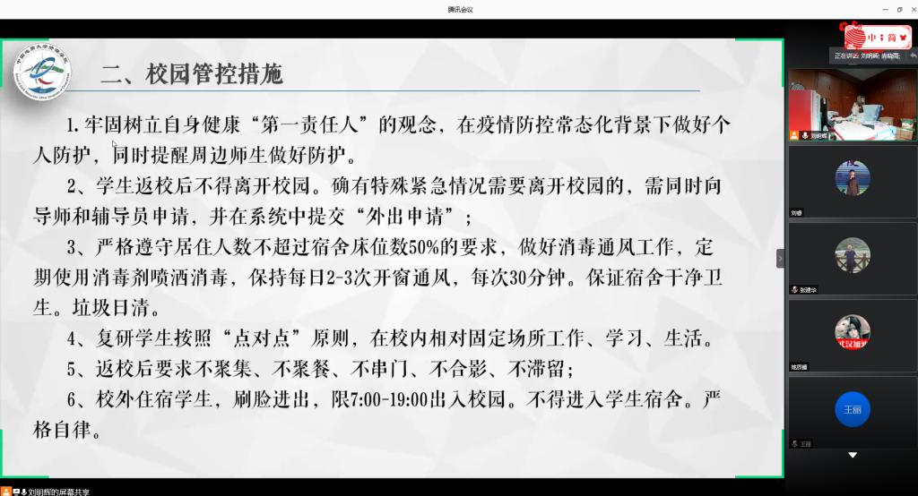 刘明辉讲解《国产精品久久久久久久久久2020届毕业生返校离校须知》。她从返校原则、返校前注意事项、返校中注意事项、入校时注意事项、校园管控措施等五个方面为返校学生全面梳理了学校疫情防控工作总要求与返校学生工作总安排,并提出“每日三次报体温”“每日签到”“戴口罩”“勤洗手”等“必做七条”和“严禁七条”。她还具体布置了“团组织关系转接”“离校手续”等相关毕业手续工作。
