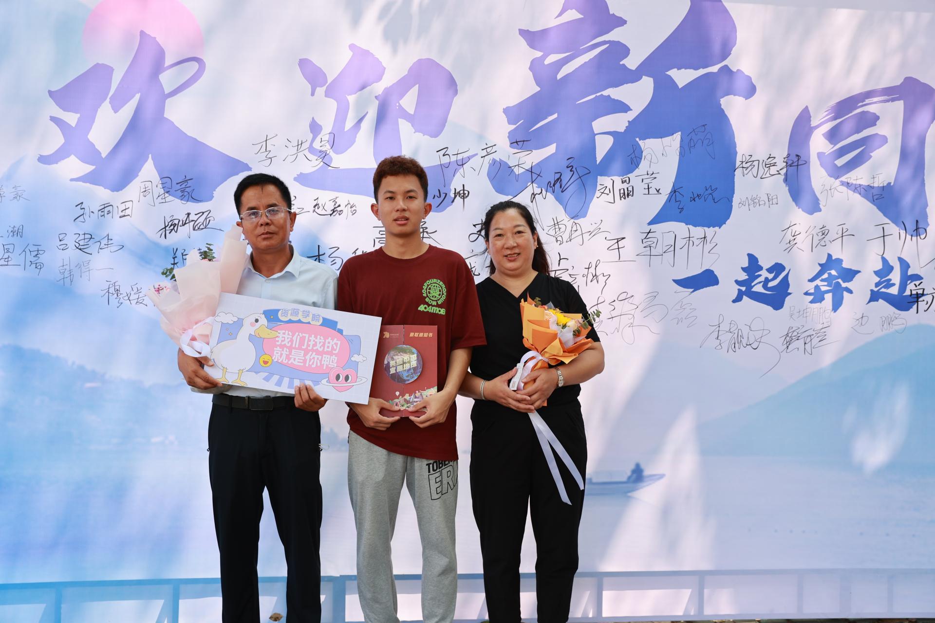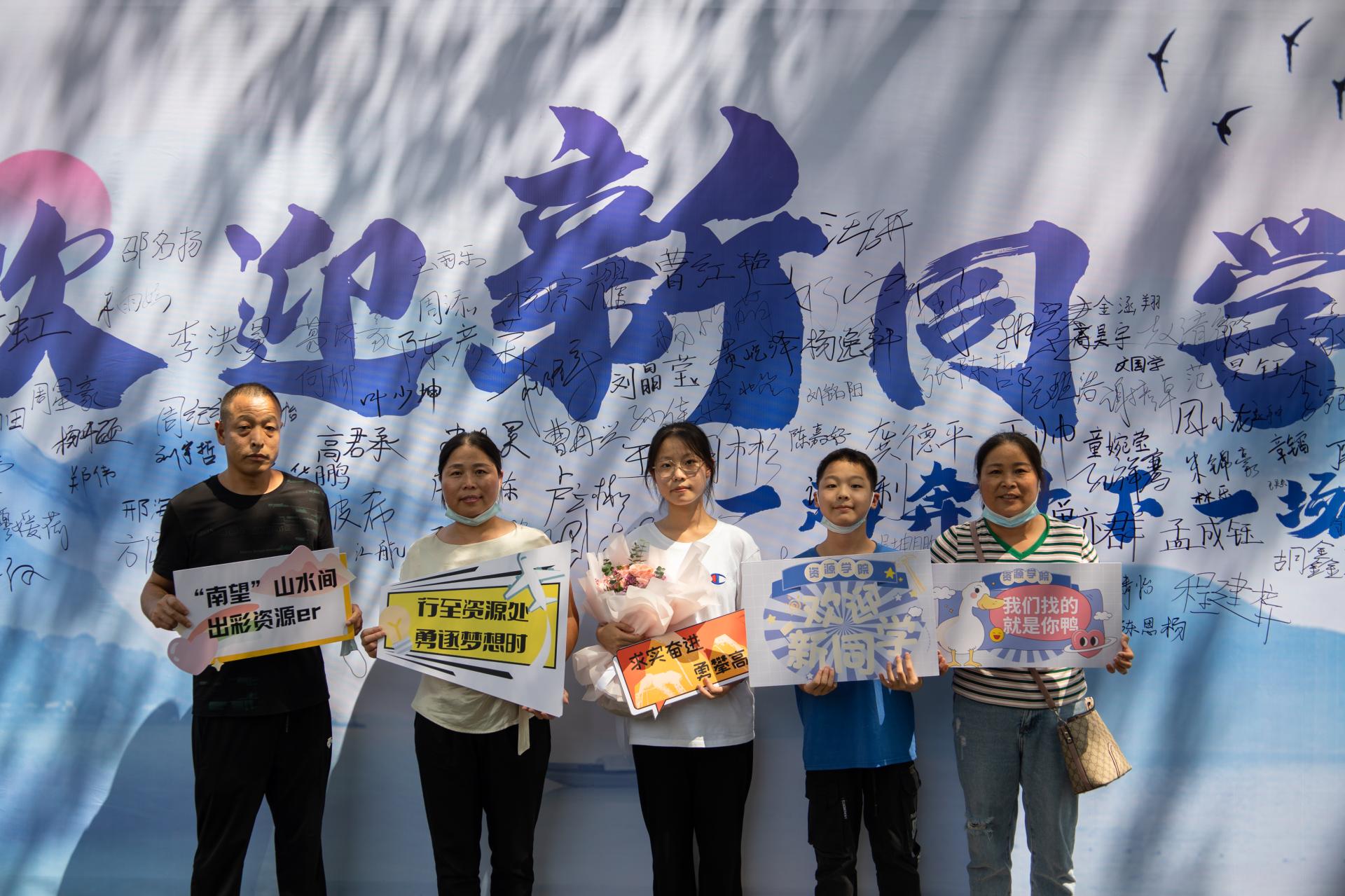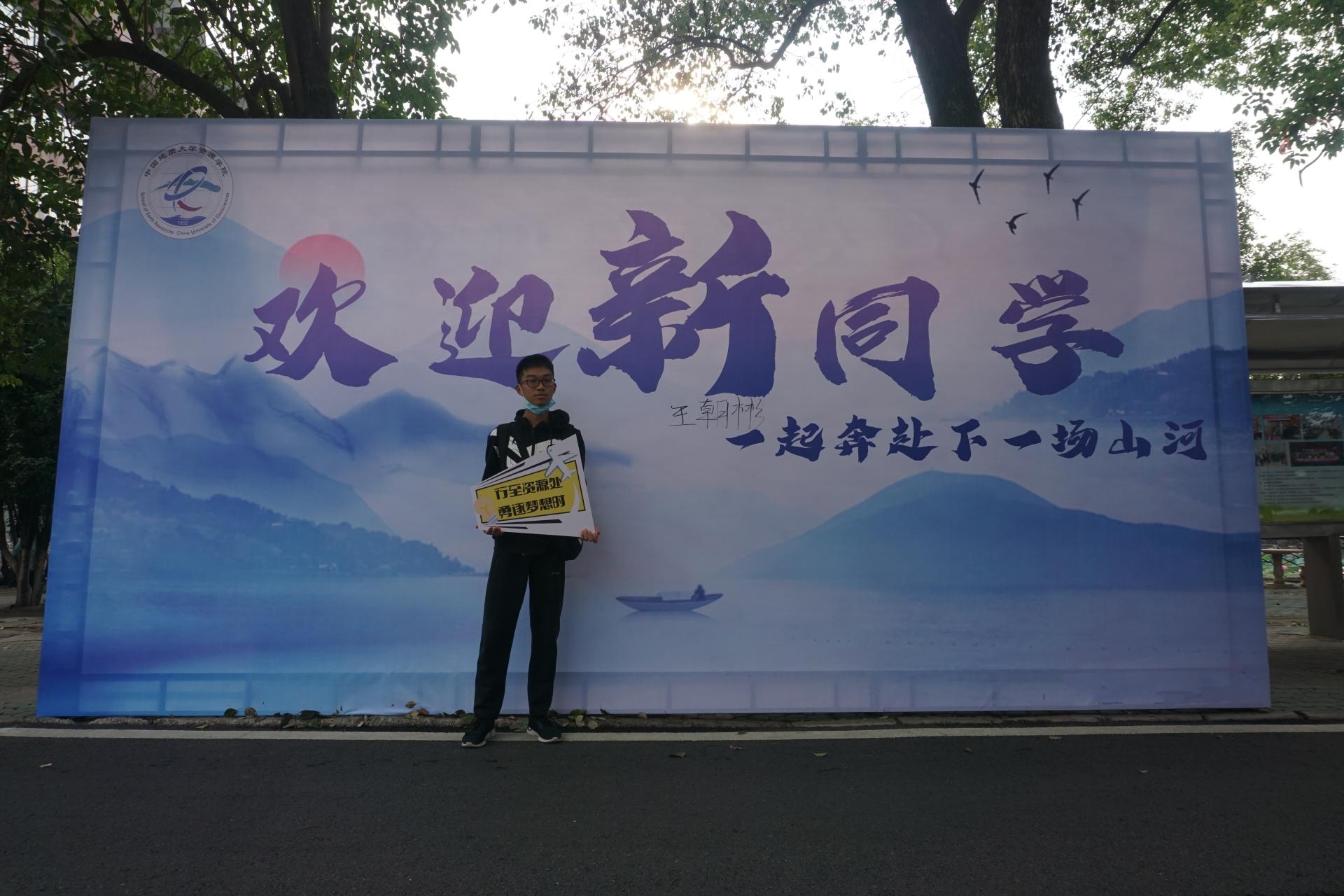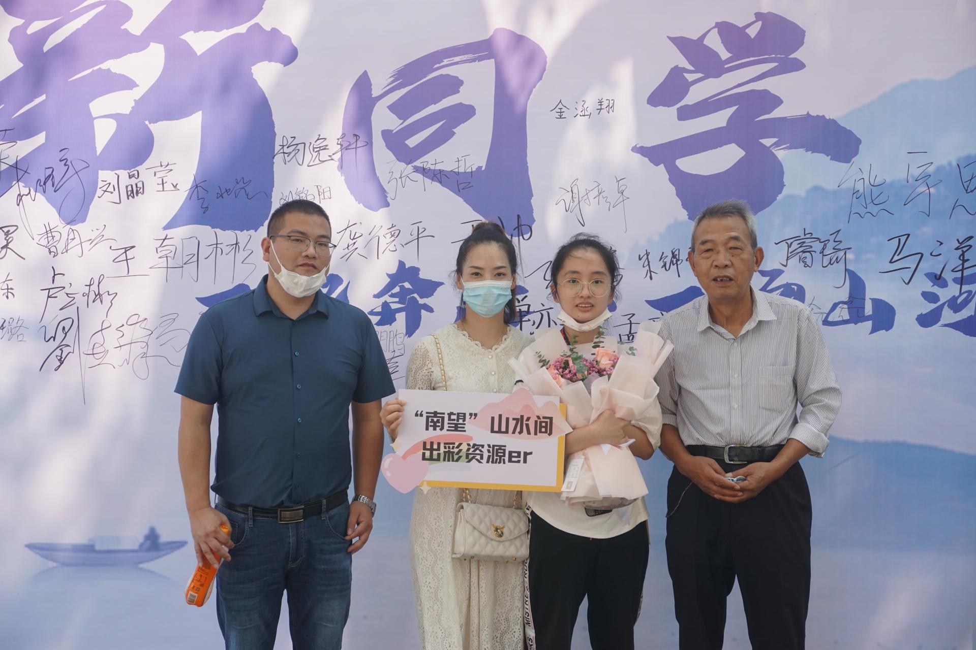 完成报道后与家人在签名墙留下了大学里的第一张合影
