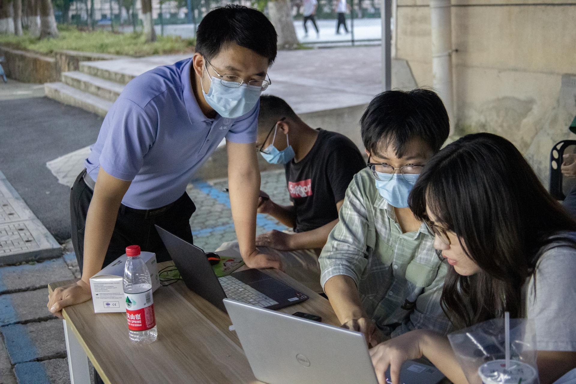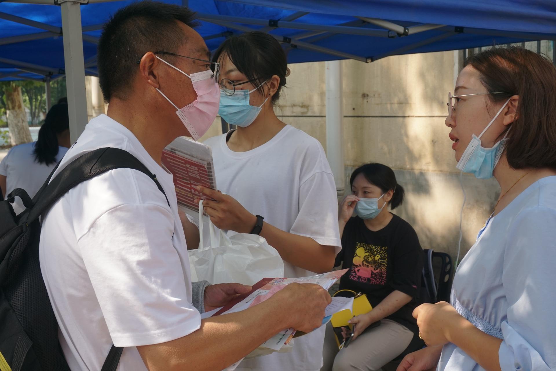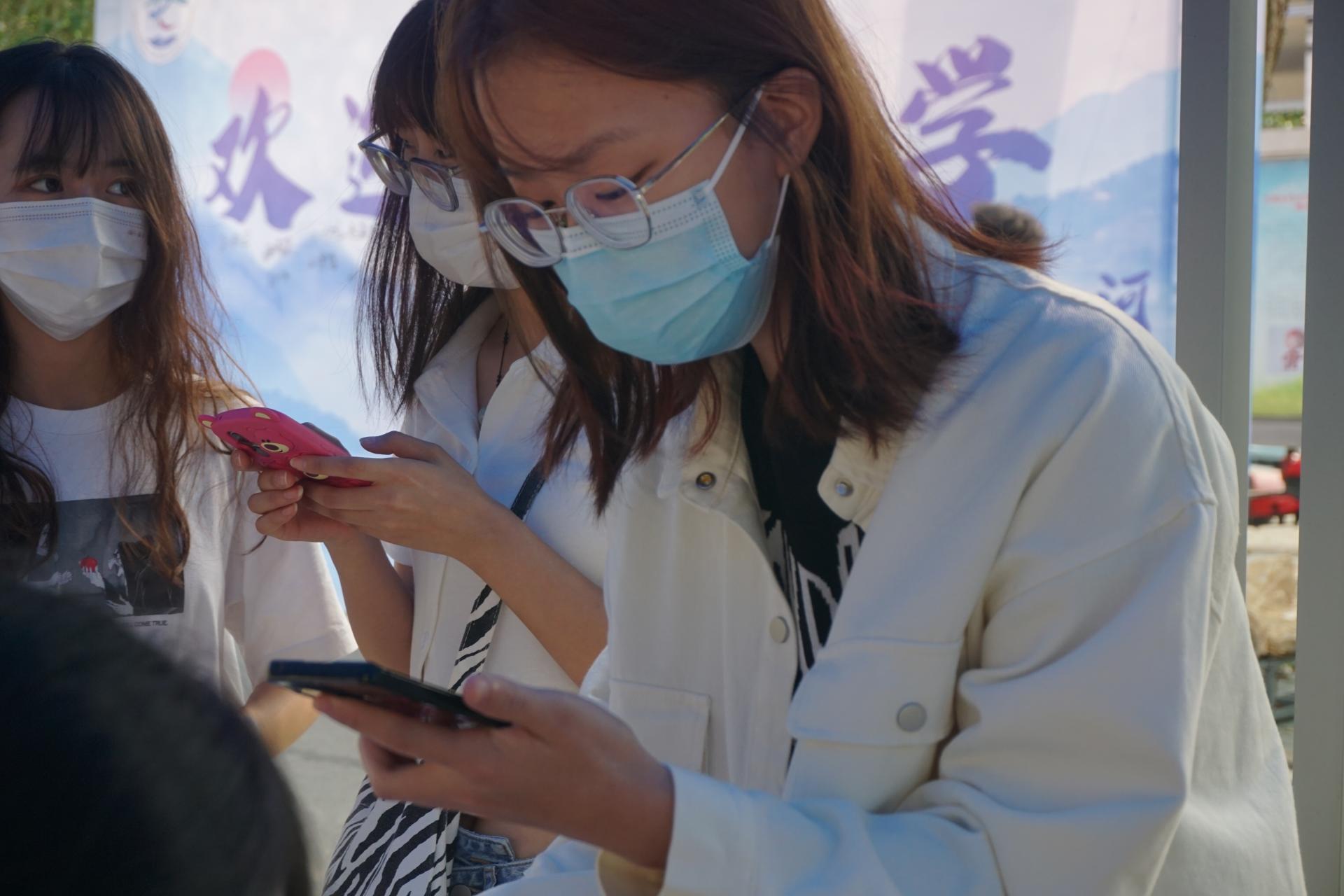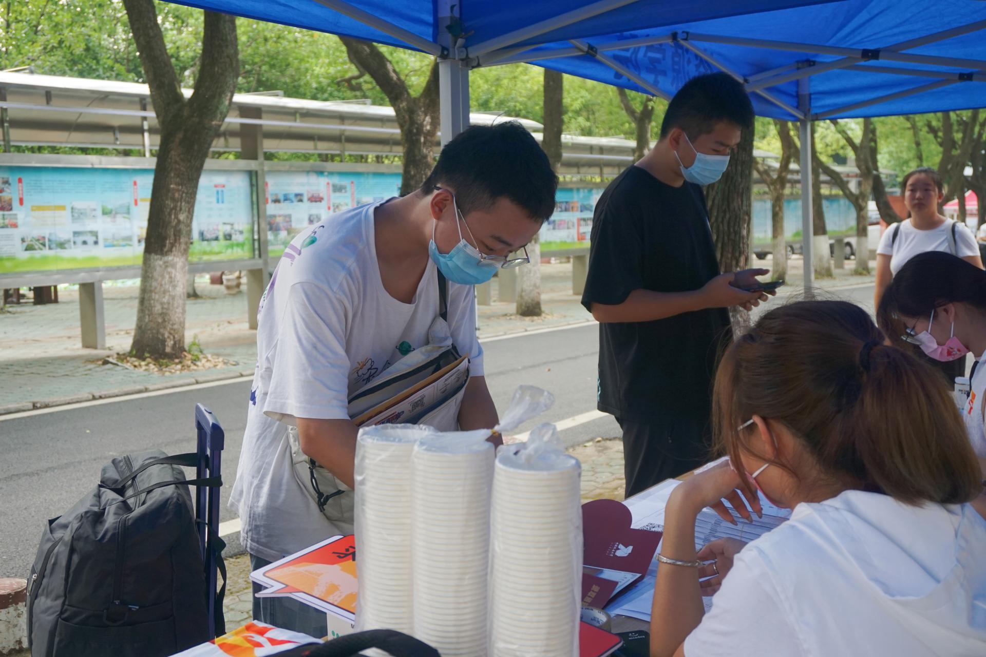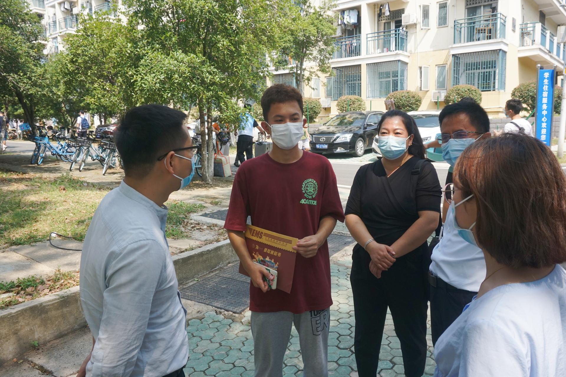 完成报道后与家人在签名墙留下了大学里的第一张合影