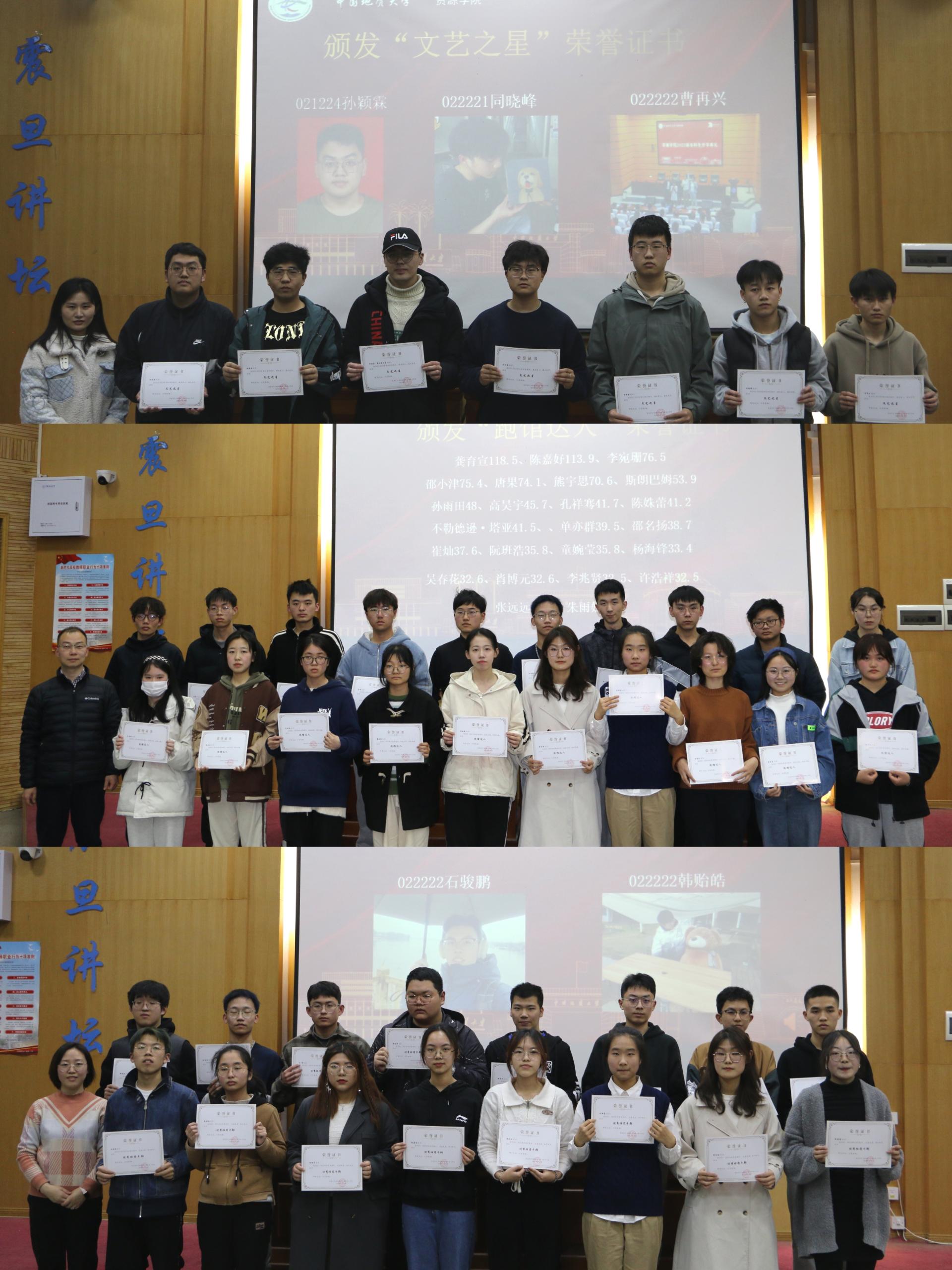 辅导员和全体班主任为“先进班集体”“最美宿舍”“学霸宿舍”“拾金不昧好青年”“志愿服务之星”“最美笔记”“学习之星”“单科优秀奖”“进步之星”“科创之星”“劳动之星”“体育之星”“文艺之星”“自律之星”“借阅之星”“跑馆达人”“优秀班团干部”等获奖集体和获奖个人颁发荣誉证书。