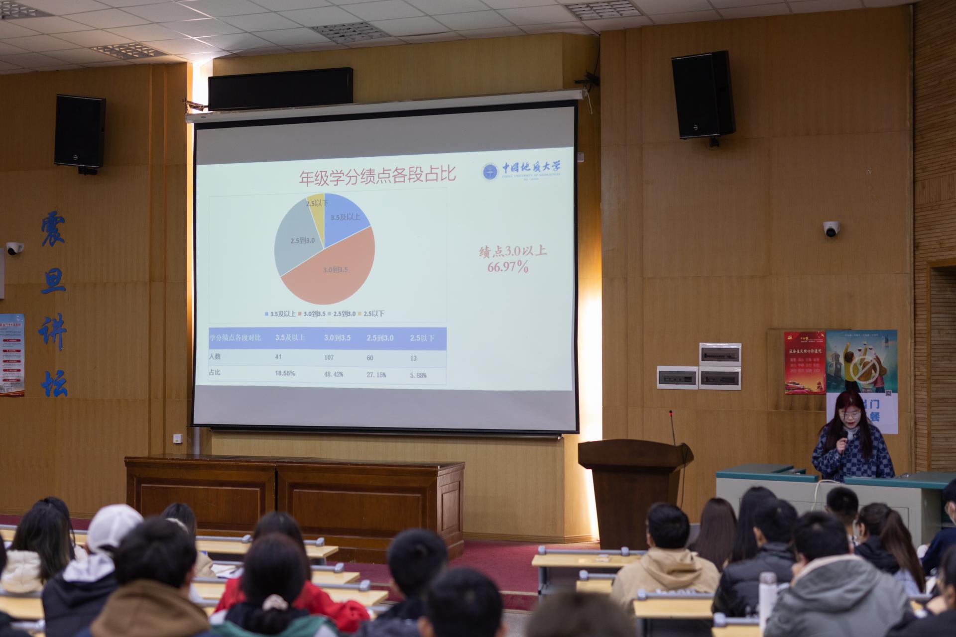 学习专员李佳乐做学情分析报告。她分析了年级整体学习成绩,对各班成绩和重点学科成绩做了对比分析,展示了年级学分绩点3.5以上同学、各班前三名和学霸宿舍。数据显示,2022级本科生平均学分绩点3.15,学分绩点3.0以上学生占比66.97%,但同时也存在学科之间、班级之间和班级内部两极分化的问题。她提到,本学期将持续开展集体晚自习、云自习、月考、基础科目辅导等学风建设系列活动。