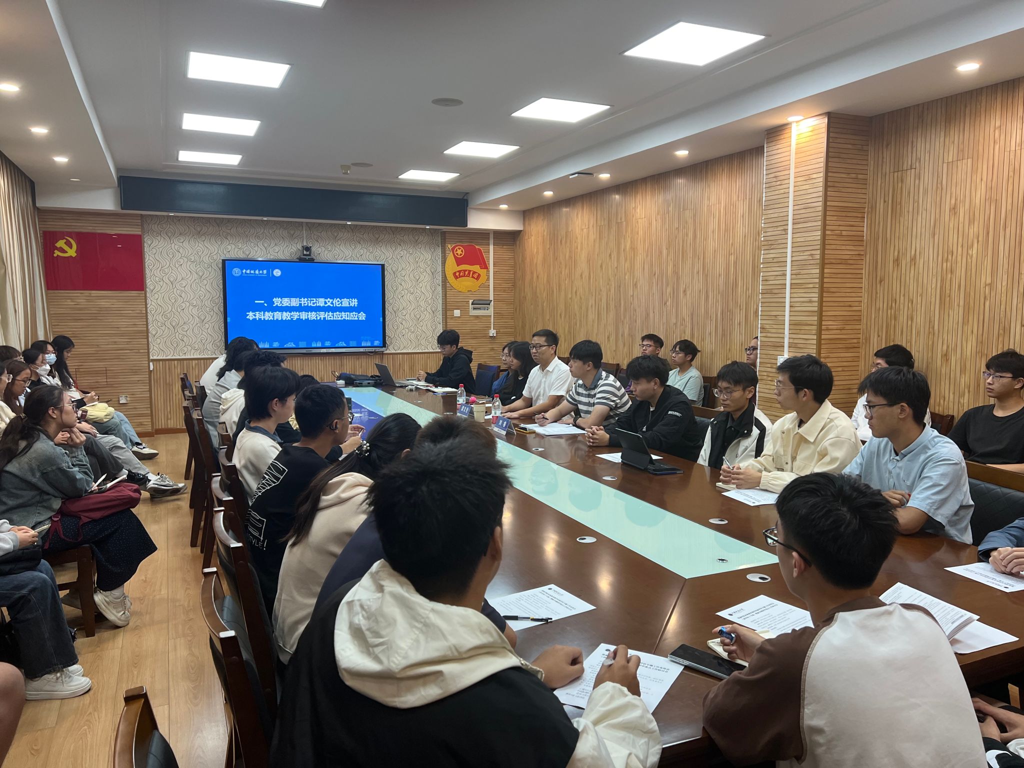 谭文伦宣讲本科教育教学审核评估应知应会。他从“学校审核评估情况介绍”“学生在审核评估中怎么做”“学院本科教育教学举措与成效”三个方面进行讲解,对新一轮本科教育教学审核评估的基本内容、评估指标、评估方法等进行了详细解读,重点领学了新一轮教育教学审核评估的基础知识、校史校情、学生如何积极参与学校的迎评工作等。他谈到,基础学风事关本科人才培养成效,事关每一位同学的成长成才,团学骨干要在各个组织、自身班级带头重视学风建设、主动参与学风建设,遵守课堂规范、维护课堂秩序。他要求,团学骨干要始终发扬先锋模范带头作用,以主人翁的姿态带头了解评估、重视评估、关心评估、参与评估,并把评估同自身学习和日常工作结合起来,不断促进基础学风、科创竞赛、楼宇文化等工作高质量发展。