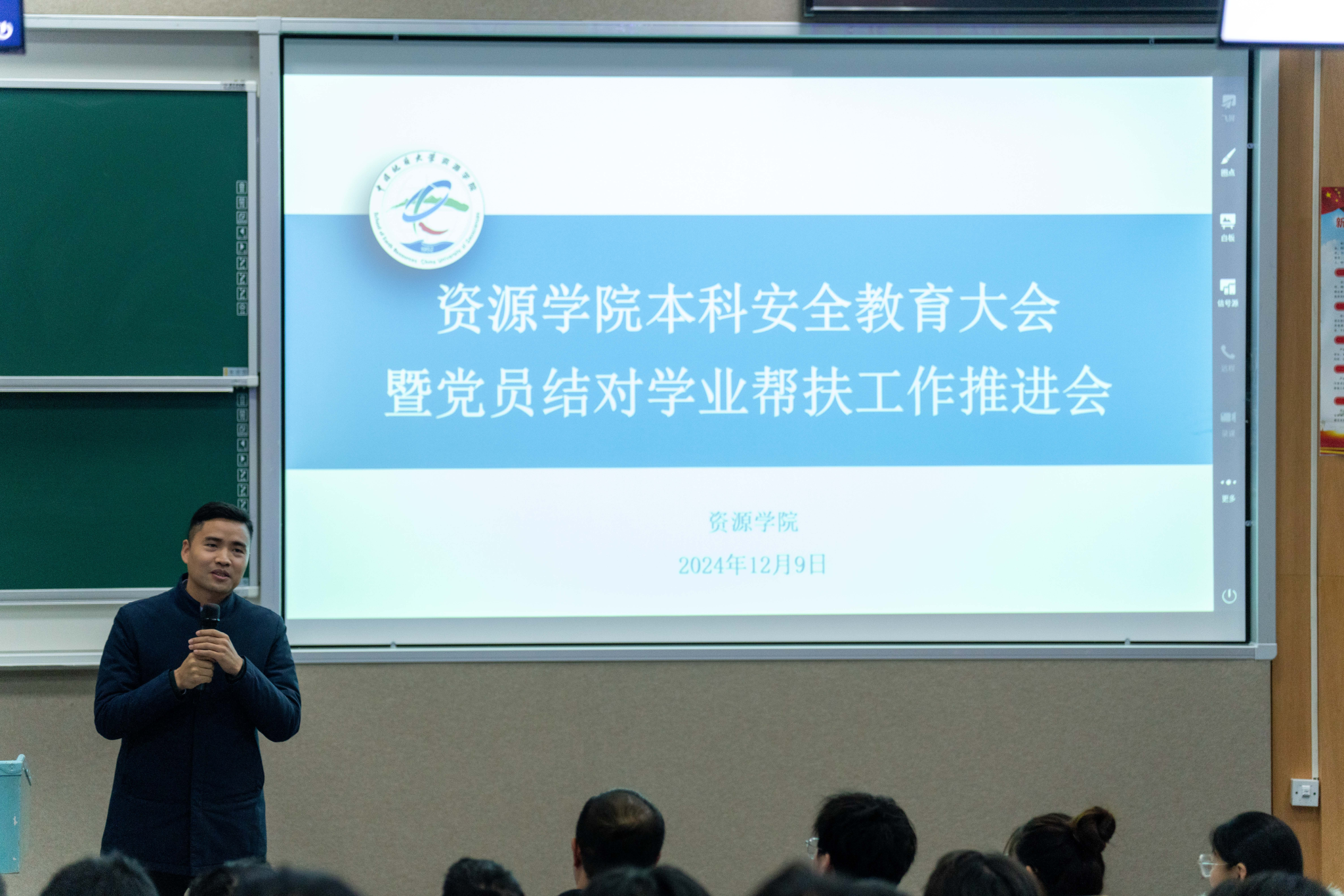 副院长李占轲讲话。他强调安全是重中之重,需同学们牢固树立安全防范意识,做自己安全的“第一责任人”。他指出党员结对学业帮扶是学院“严在地大 学在资源”学风建设品牌的重要活动,不仅可以强化党员的责任担当和先锋模范作用,还能促进同学间的互助学习和成长,希望结对同学紧密联系,用好资源,勤学多练,营造互帮互助、共同进步的良好学风。
