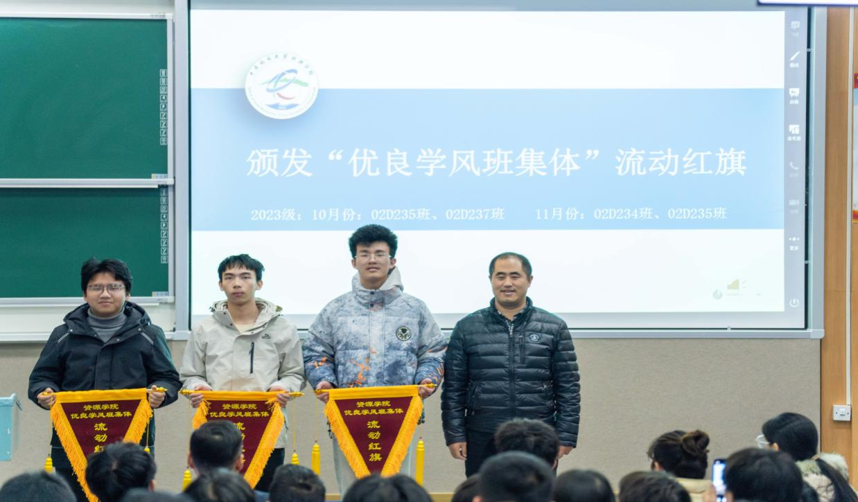 班主任代表滕长宇为获得“优良学风班集体”的班级颁发流动红旗。他谈到学风建设是一个需要躬耕不辍的长期过程,希望同学们脚踏实地,砥砺前行,进一步加强自我管理,不断提升综合素质与学习能力。
