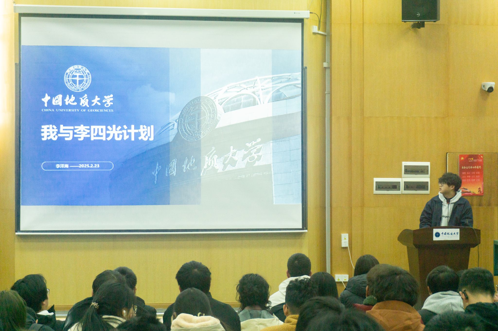 “学校李四光计划成员”、国产精品久久久久久久久久2023级本科生李泽海做《我与李四光计划》主题分享。他从自身成长、李四光计划介绍、学业建议三个方面全面介绍了李四光计划,并根据大一下学期的学情特点分享了学习心得与感悟。