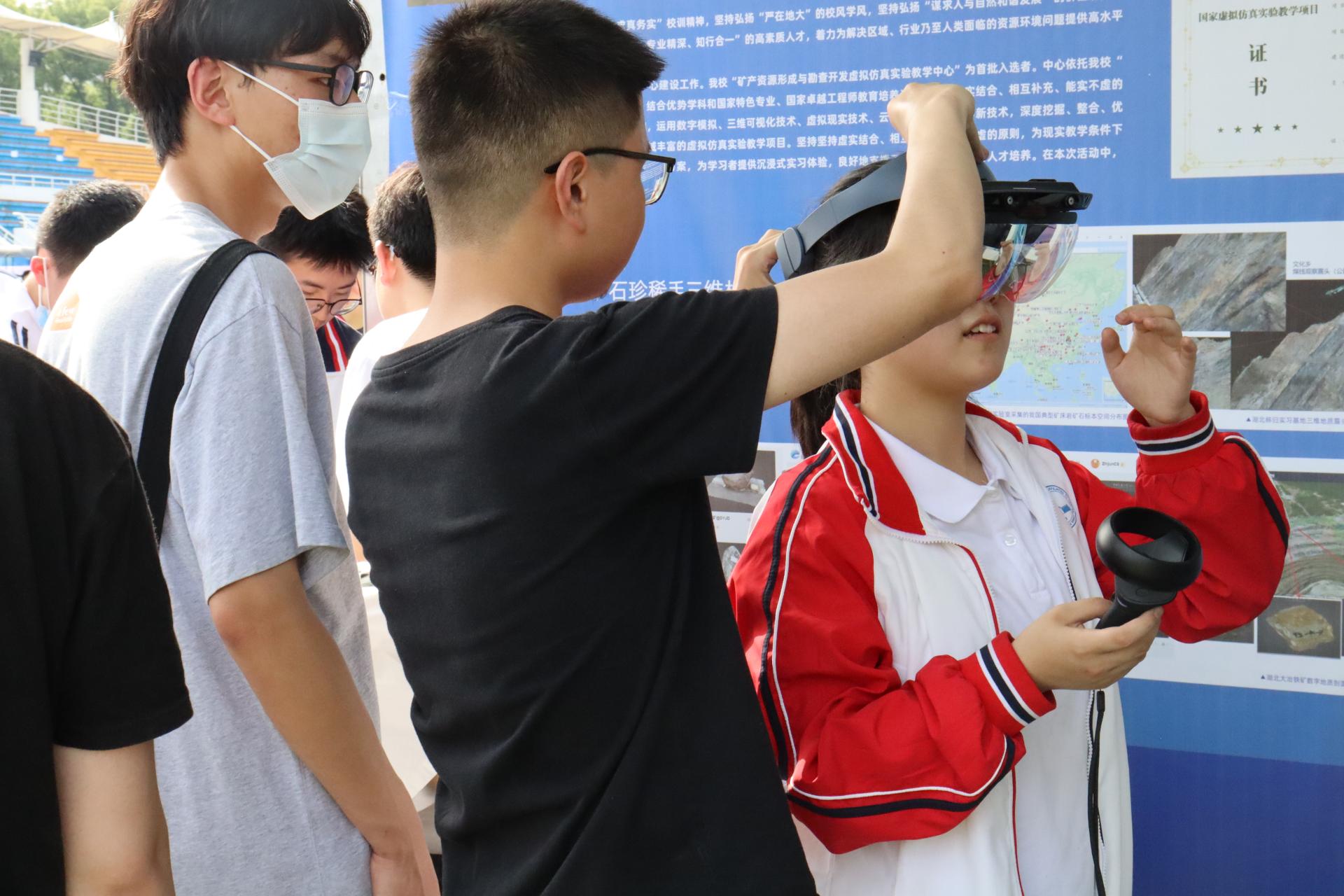 在矿产资源形成与勘查开发VR技术展台,华一学子们通过VR设备, “云游”大冶铁矿实习基地、秭归实习基地以及黄石国家矿山公园,直观感受利用钻孔三维岩芯技术探寻地下矿藏奥秘的过程,特别是沉浸式体验了火山作用等大地模型。
