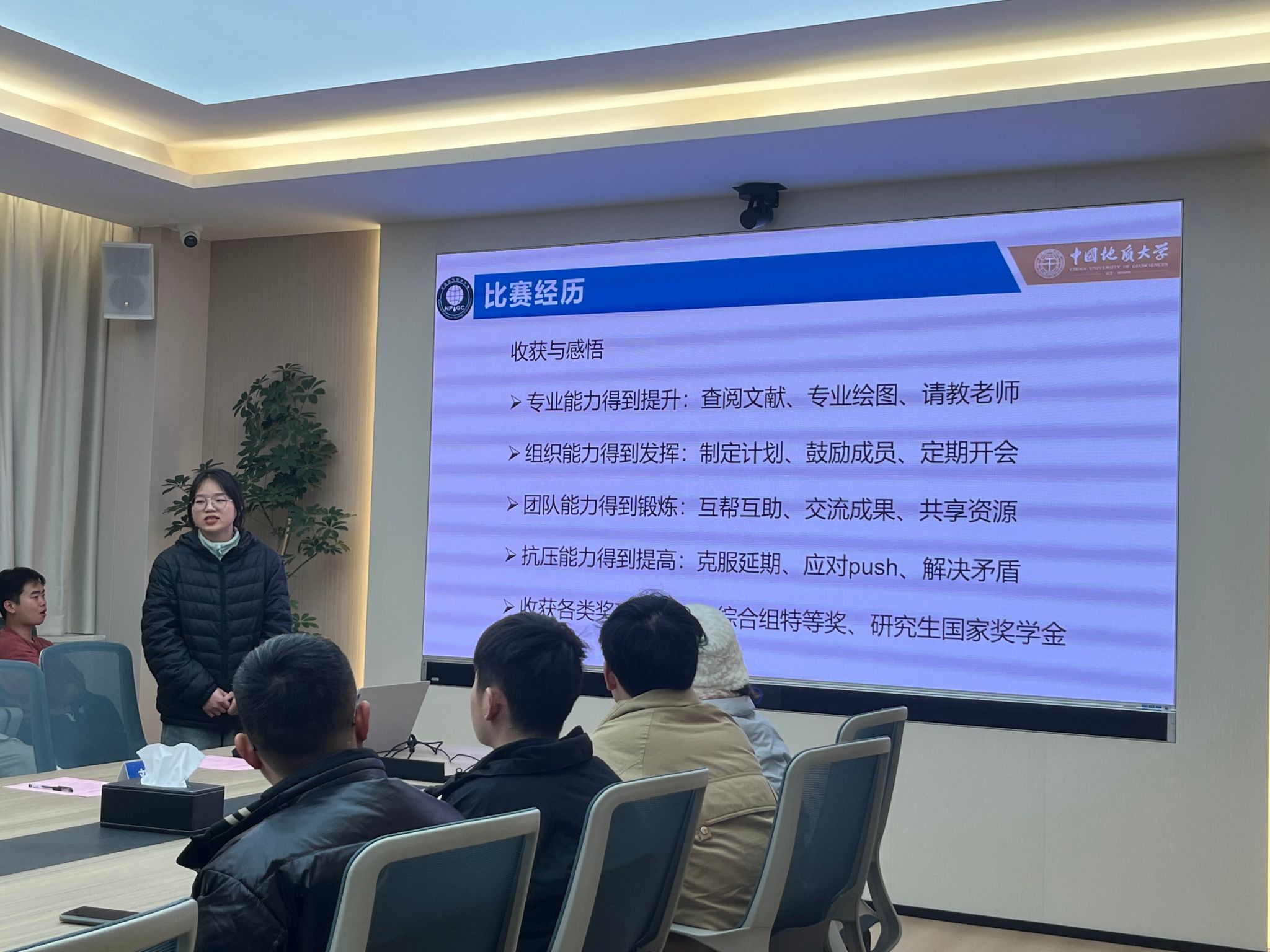 王诗琪做题为《行业学生科技竞赛赛制分析与实践——以第六届全国油气地质大赛为例》的主题报告。她从准备工作、绘制图件、撰写报告、制作PPT和经验教训五个方面进行大赛经验分享,并表示要仔细阅读大赛要求,勤与指导老师进行交流,提前完成制定的计划,特别是综合组的选手,组内成员一定要相互监督,及时提交阶段性成果,交叉检查内容和格式。