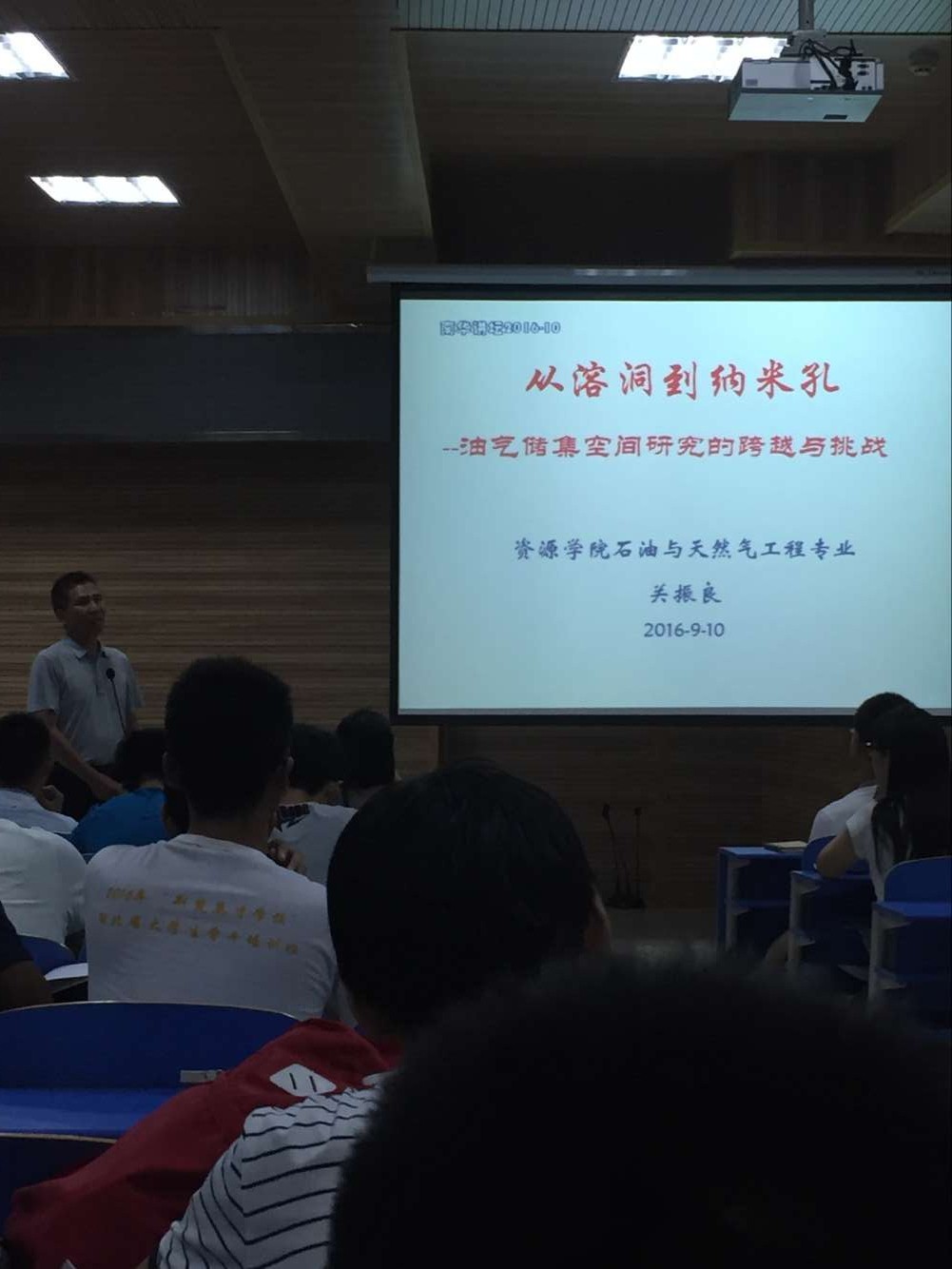 9月10日教师节来临之际,国产精品久久久久久久久久秭归实习教学团队队长关振良教授在综合楼三楼阶梯教室给基地师生演讲了一堂题为“从溶洞到纳米孔—油气储集空间的跨越与挑战”的公开课。此次南华讲堂是秭归产学研基地的传统项目,旨在邀请经验丰富的教授、专家介绍实习区相关的地学知识和人文知识,对开阔学生视野、激发学生的学习兴趣,以及更好地了解秭归基地的地质构造特征有重要意义。