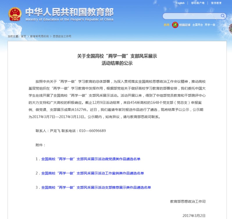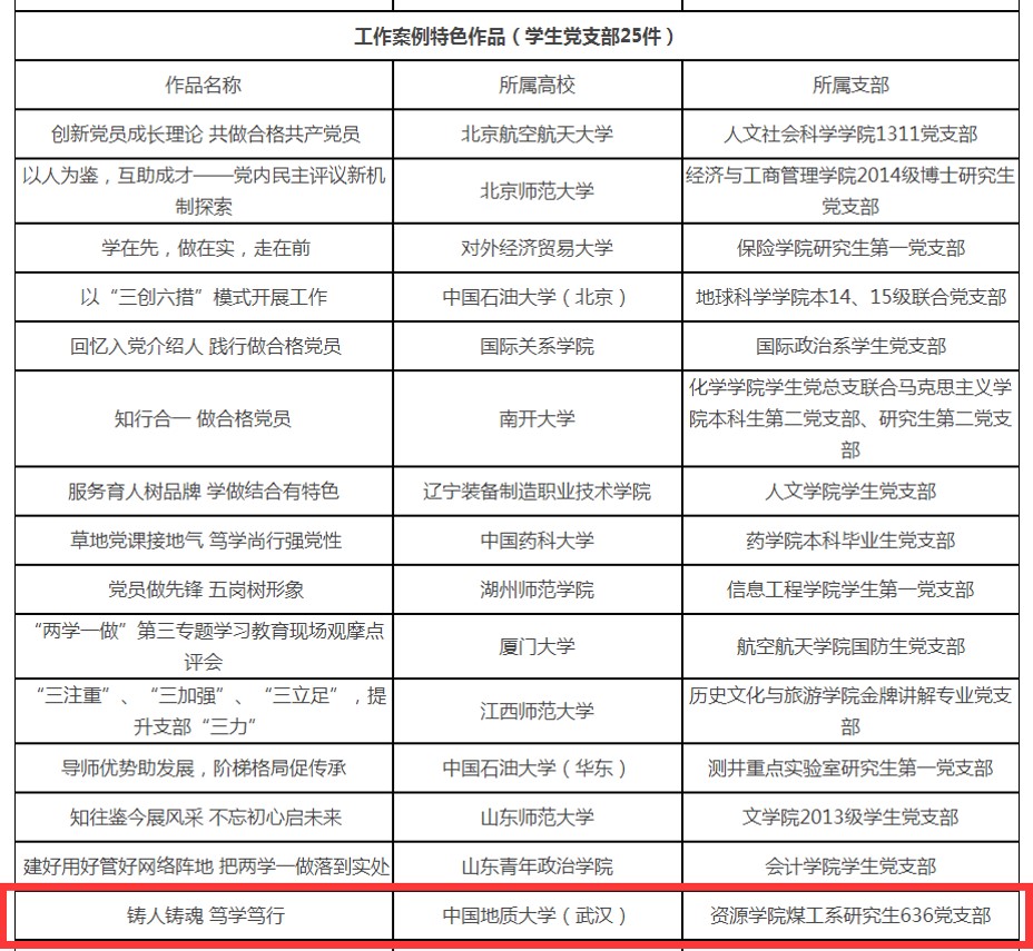 树立典型,加强宣传,学习效果持续提升。学院加强党徽照我行和示范党支部的培育工作,积极推荐优秀的支部和党员参加学校层面的评比。2016年研究生示范党支部评选活动中,煤工系研究生636党支部获评校研究生“十佳党支部”;在学校的十佳党员评选中,2013级林少伟同学获得了校级“十佳学生党员”称号。同时,学院还推荐煤工系研究生636党支部参与全国高校“两学一做”支部风采展示活动评比。近日,煤工系研究生636党支部作为我校两个学生党支部之一入选全国高校“两学一做”支部风采展示活动工作案例类作品遴选名单。林少伟同学在2016年“百生讲坛”中获评省级优秀主讲人。先进支部和党员典型的涌现,进一步推动了学习效果的持续提升。