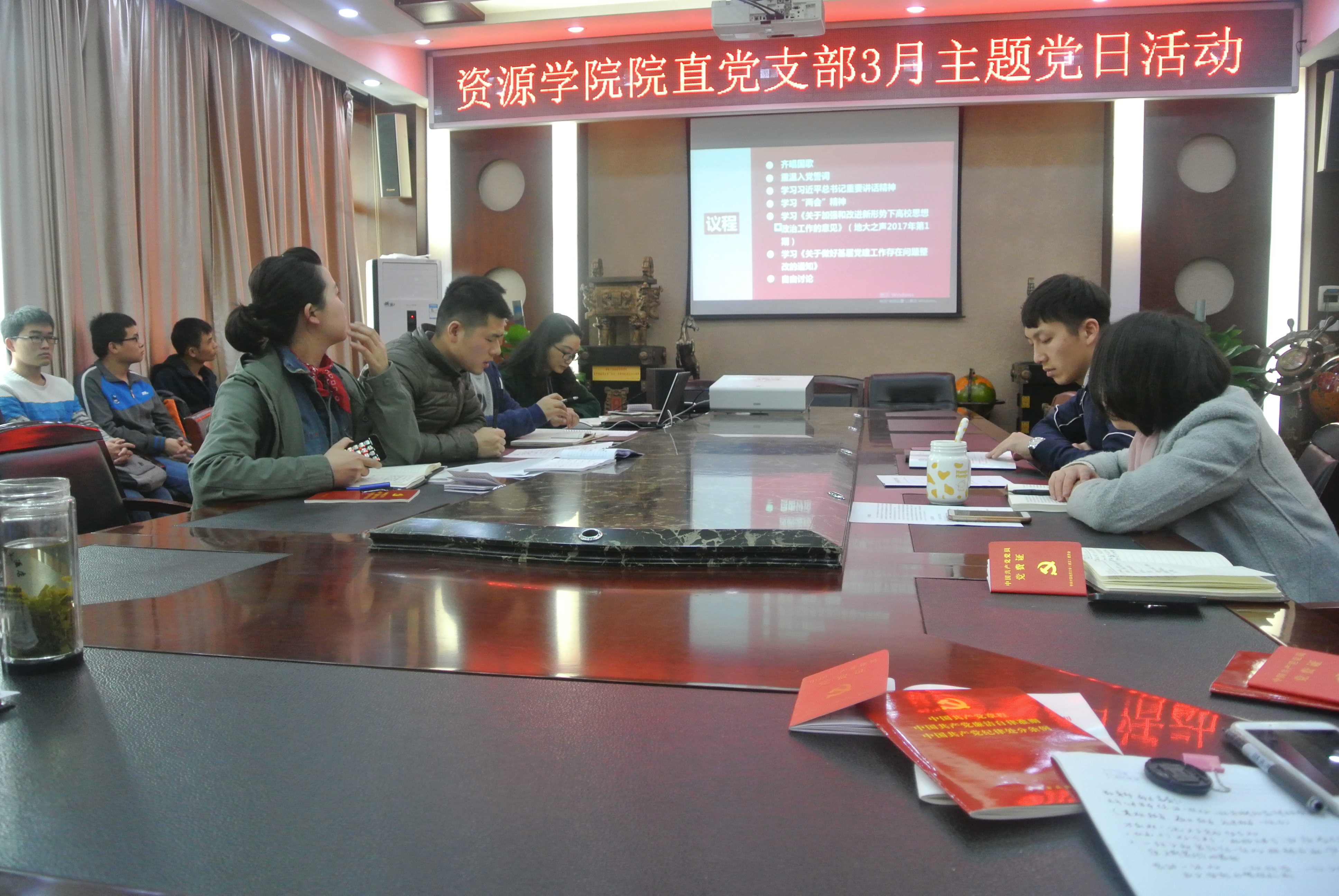 活动伊始,全体成员齐唱国歌,在场党员重温入党誓词。接着,大家观看了《习近平用典》的政论微视频,学习习总书记系列讲话精神。随后,院直党支部成员郭秀蓉同志带领大家一起学习“两会”精神。她用一系列详实的数据和具体的举措让大家了解政府在2016年取得的成绩和2017年的工作目标;对于大家普遍关注的教育类问题,她也进行了讲解。