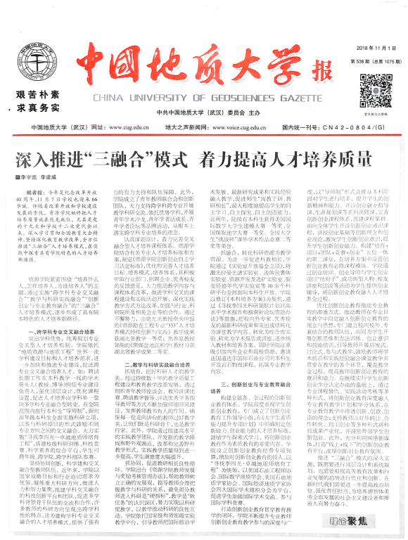中国地质大学报第538期(总第1075期)第二版全文刊发李宇凯书记、李建威院长撰写的文章。