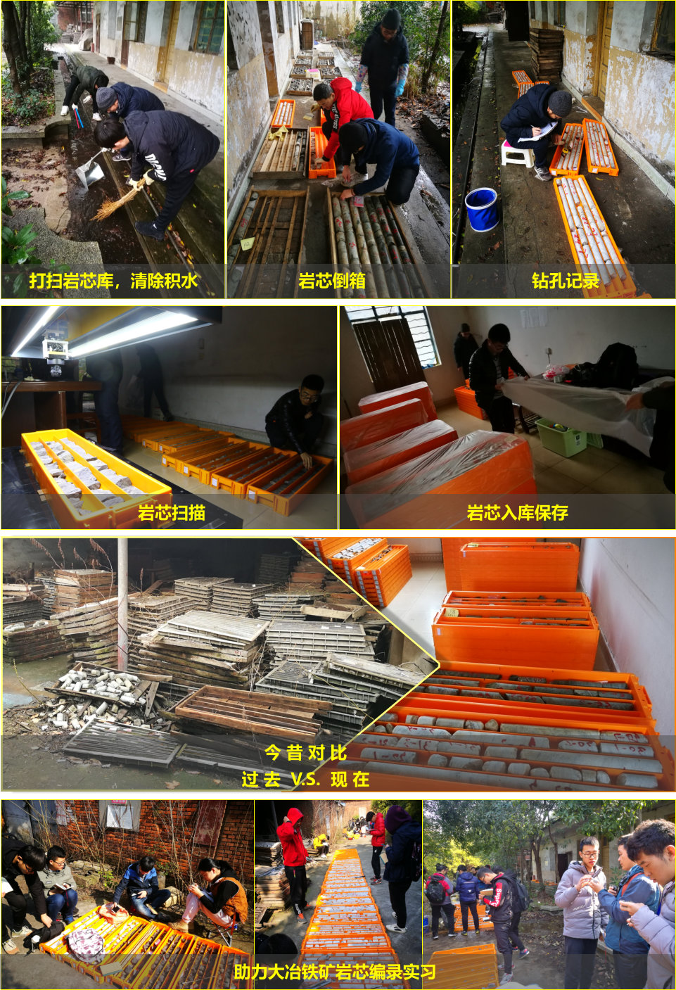 2019年2月26日至3月9日,矿产资源形成与勘查开发国家级虚拟仿真实验教学中心、国产精品久久久久久久久久陈志军老师团队及合作公司技术人员前往大冶铁矿开展了11根典型钻孔的岩芯倒箱、岩芯图像扫描工作。大冶铁矿岩芯库所在的钻机队用房常年处于无人管理状态,钻孔堆放混乱、岩芯箱损毁严重,对典型岩芯亟需加强保护以便资源勘查工程(固体方向)专业的岩芯编录实习常态化开展。