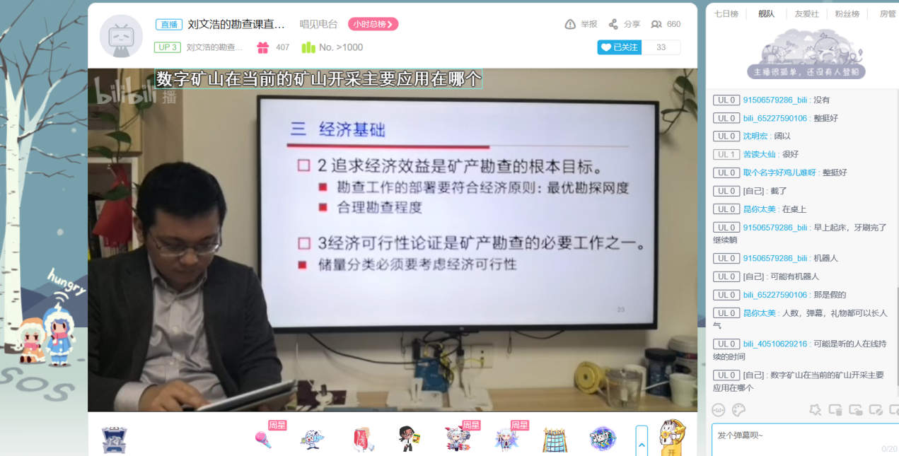 《矿产勘查理论与方法》主讲教师刘文浩巧借家中已有的工具和设备,成功地当上了学生们的“网红”。他将电视机变成黑板,把手机固定在自拍杆上,用哔哩哔哩平台进行直播授课,手中的IPAD可以随时查看直播状况,也可以通过弹幕提问的方式增进师生互动。由于直播平台信号稳定,电视机画面清晰,刘老师讲课也提纲挈领、风趣幽默,因此收获了学生们的一致好评。