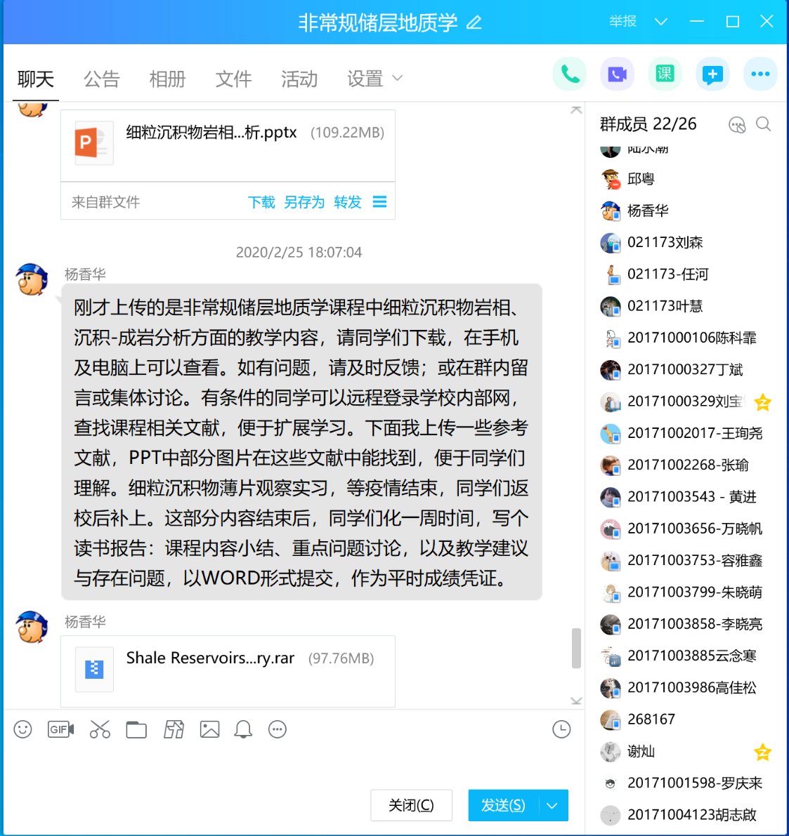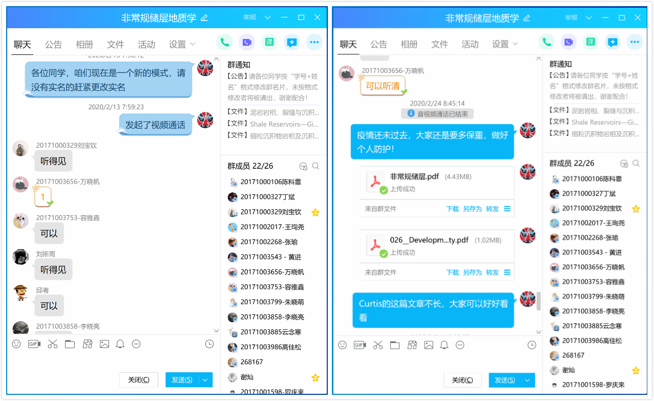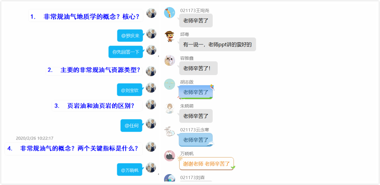 以上4门课程经过3周的网络教学,除了偶尔会受网络的流畅度影响外,学生反映效果良好。除以上4门课程外,资源勘查工程(新能源英才班)本学期还有《地热资源勘查与评价》、《测井地质学》、《地震地质综合解释》3门专业主干课程,目前也都针对疫情发展做好了回归课堂和网络授课的两手准备。