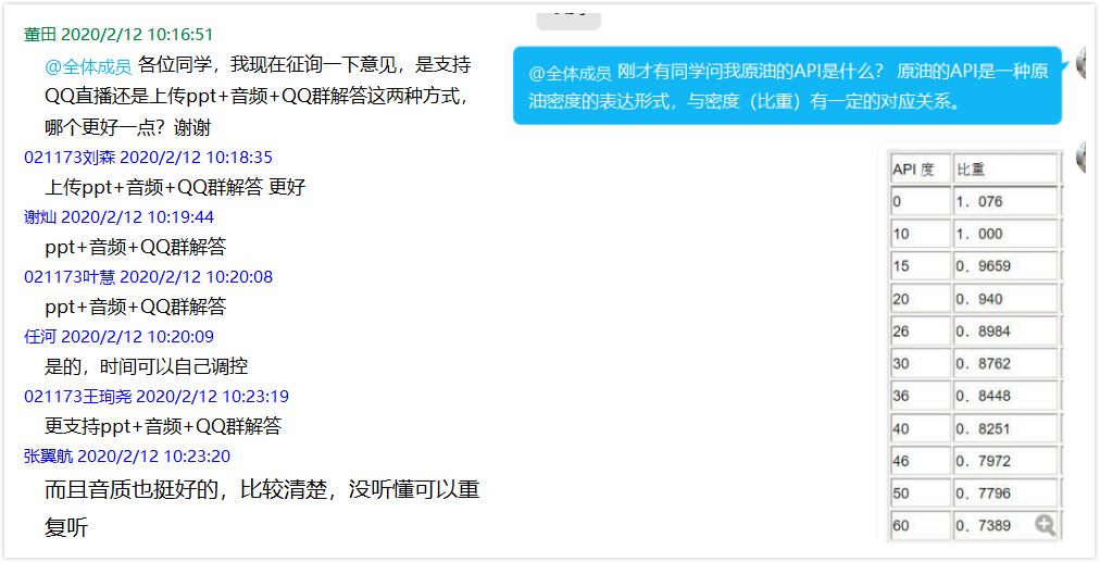本课程由董田、韩元佳、平宏伟3位教师承担,董田教授课程总负责,并配备1名研究生担任助教。在积极了解了多种线上课堂教学工具和方法之后,以及考虑受网络条件的限制,最后决定以QQ群为本门课程的主要教学方式。具体的操作方法是利用QQ群上传ppt课件以及相关的视频,每张ppt插入详细的音频讲解。QQ群与讨论小组与学生交流,接受反馈,共同解决学习中遇到的问题。学生遇到不懂的问题也积极讨论。每两周组织一次学习内容的回顾和互动,通过腾讯语音通话的功能和QQ直播功能提问学生问题,展开讨论和讲解。