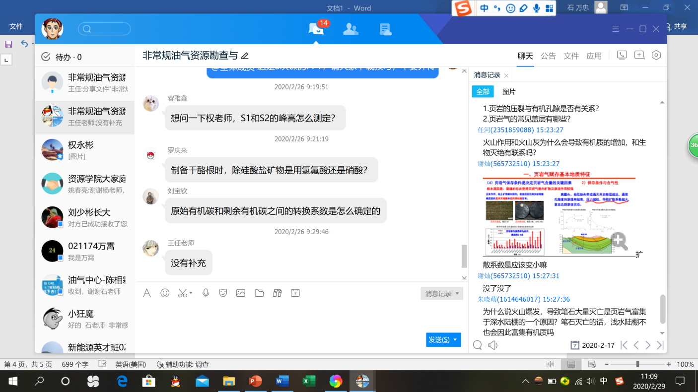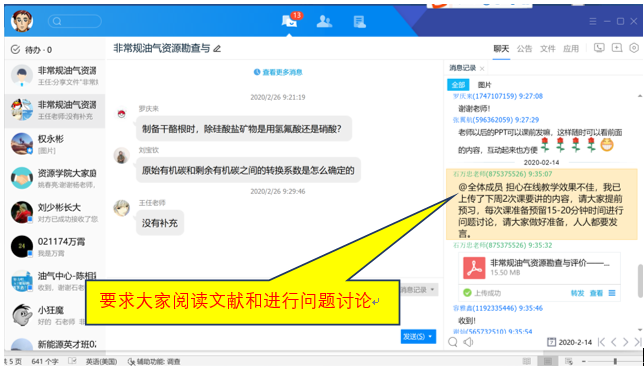 本课程由石万忠、李水福2位教师承担,石万忠教授课程总负责,并安排新进教师王任、权永彬助课。课程采取腾讯TIM视频授课。由于这门课程为新开课程,缺少教材,为此从网上下载并优选了40篇文章发给同学们进行阅读,通过和他们讨论文章内容来督促同学们阅读文献。为了提高学习效率,课前把讲课PPT发给同学们提前预习,课后留15分钟左右进行问题讨论