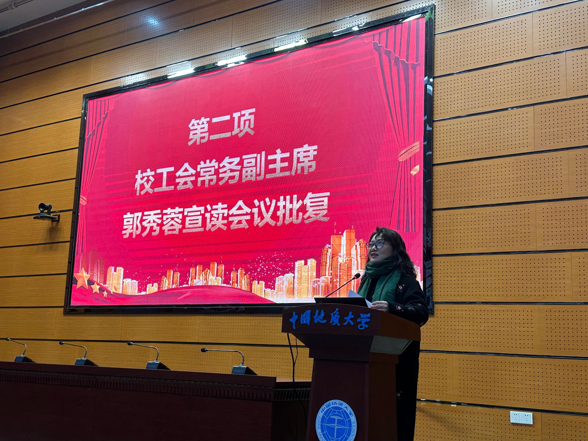 郭秀蓉宣读《国产精品久久久久久久久久第四届教职工代表大会第三次会议暨第四届工会会员代表大会第三次会议的批复》。