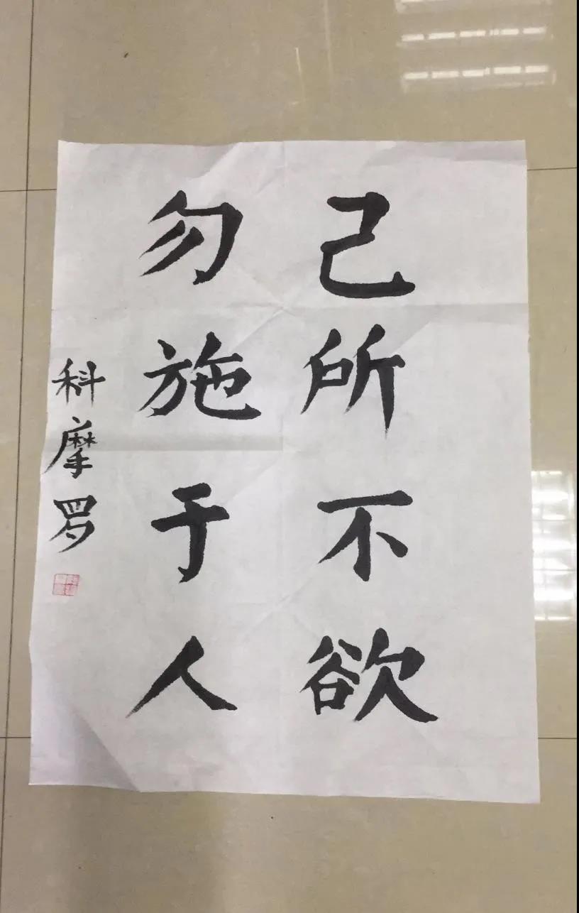 在地大求学时,除了固定的课程和实验外,阿拉丁每天的生活都是丰富多彩的,“我特别喜欢运动,一般周末的时候会和朋友们出去踢球,打排球等等。我也很喜欢中国的舞龙,以前还参加过我们国际教育学院的舞龙队。”值得一提的是,阿拉丁不仅中文说的特别好,他还特别喜欢中国的书法,并且特意展示了他书写的“己所不欲,勿施于人”。