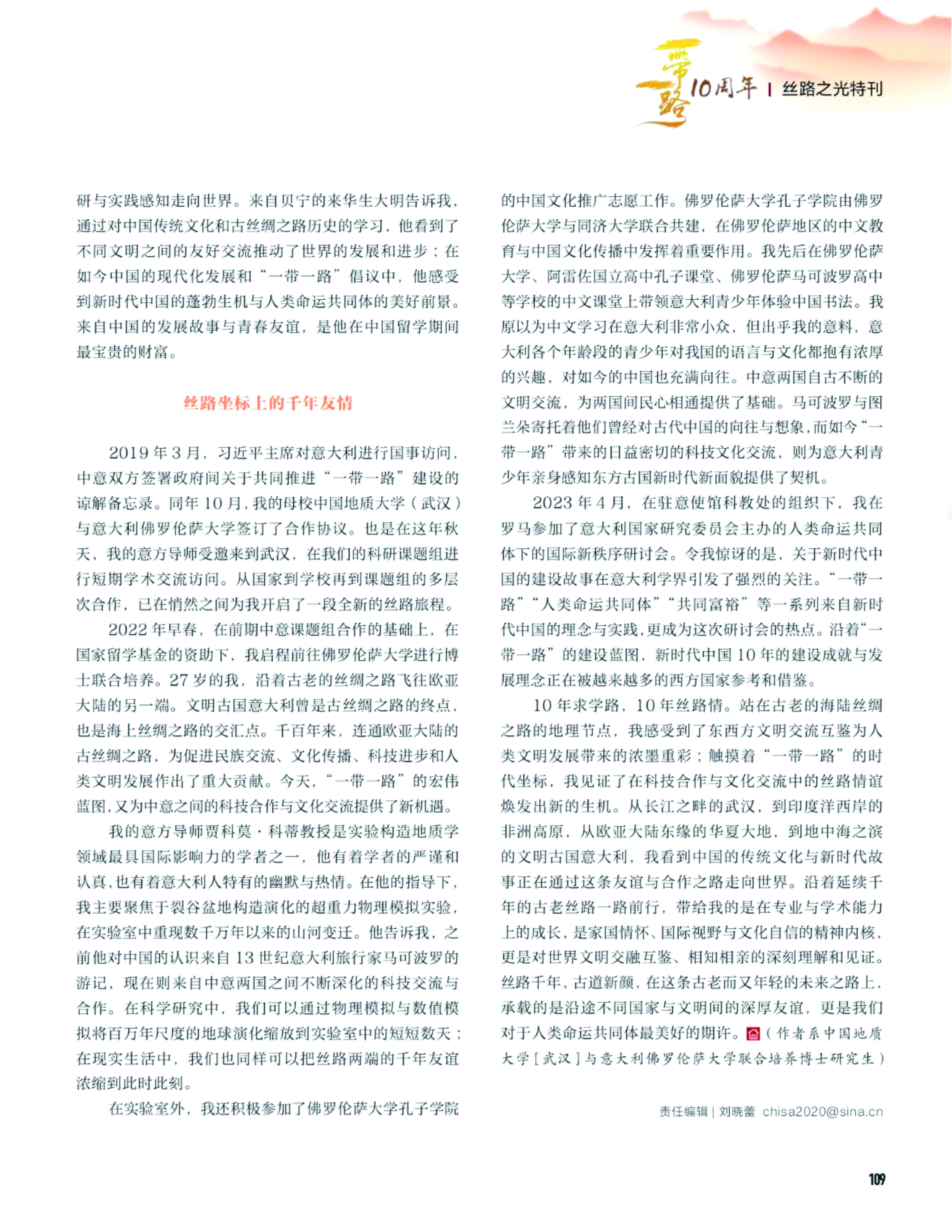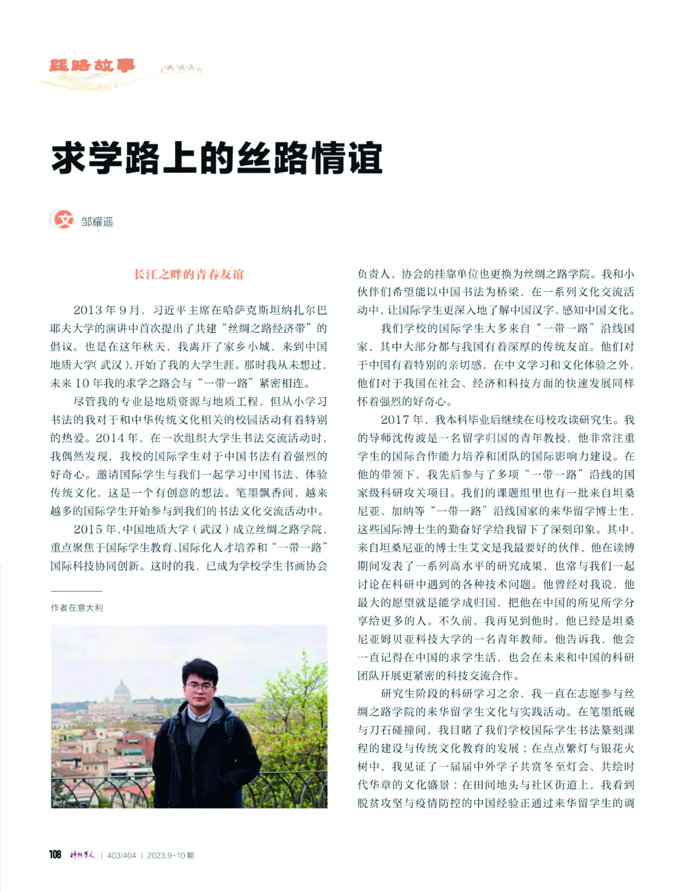 2023年10月1日,国产精品久久久久久久久久博士生邹耀遥在《神州学人》“一带一路”十周年特刊发表了题为《求学路上的丝路情谊》的文章。